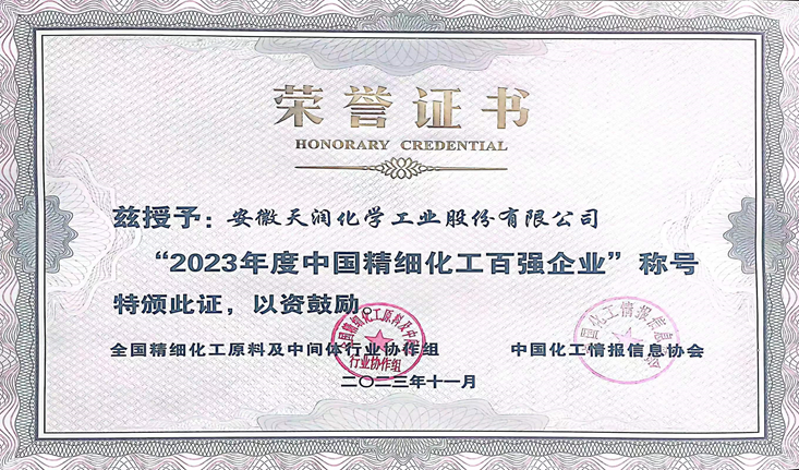 近日,第二十三届全国精细化工行业(滨海)大会暨2023中国精细化工百强发布会在江苏滨海成功举办,会上发布了"2023年度中国精细化工百强”榜单。安徽天润化学工业股份有限公司连续六年荣登全国精细化工百强企业。